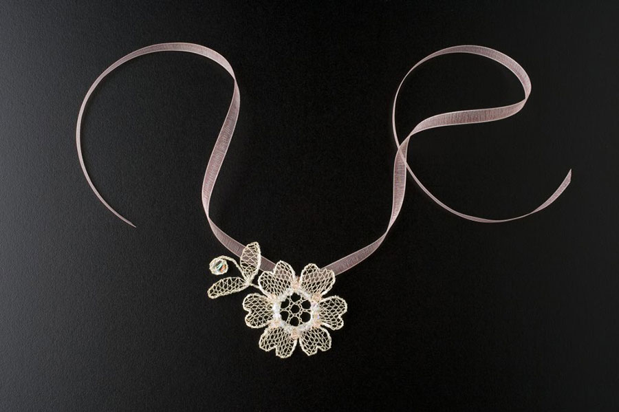 Traditional Chantilly lace designs are the embodiment of delicacy, refinement and beauty. Their floral compositions offer an endless inspiration. I love Chantilly, it is my favourite lace. It always invites me to create. Projected into the three-dimensional space, the flowers and bouquets become alive in pendants, rings and necklaces. A difficult technique to master in metal, Chantilly also constantly challenges my skills and my patience. Each piece is a long journey, and at the end there is no better reward than to see how Chantilly lace jewellery accentuates the beauty of women who wear it.