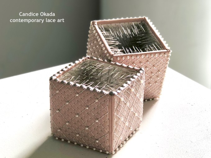 The work, titled “Eva Hesse, I have a present for you:Mind all the little Pricks” (2018) offers a unique look at handmade lace. The artwork consist of two embellished boxes with their sides open to expose the pins that were used in lace construction. The luxurious object with delicate lace pattern thus uncovers a rigorous process of bobbin lacemaking, which relies on support of hundreds of strong steel pins. This surprising revelation presents both sides of handmade lace – the outside form, pleasing to senses, and the inside framework that engages the mind. The temporary pin structure, exposed to viewers, confirms the laborious nature of lacemaking process. It also delivers a fact usually hidden to the uninitiated – that the fine lace work requires not only patience, attention to detail and nimble fingers, but also a very logical, mathematical mind.