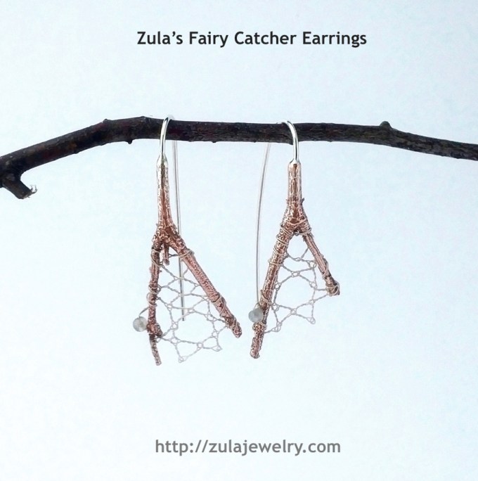 Another up-and-coming lace artist, Urzula, of Zula Jewelry, is exploring bobbin lace applications in jewelry making. Her new line of Fairy Catcher earrings combines a delicate wire lace nets with nature inspired designs, and the Light Shield infuses lace with light in bold wearable art pieces. Zula had a special opportunity to present her new work in the juried show at SNAG Conference in Portland, Oregon, USA, in May.