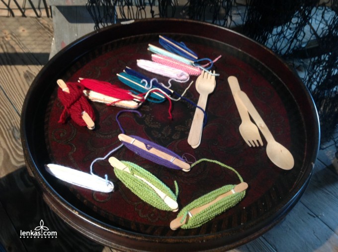 The event organizers prepared for us a sturdy frame with stretched fishing net. We brought a vintage lacis tablecloth as an example, instruction sheets with basic stitches, and lots of colourful yarns. Festival volunteers helped with winding the net shuttles, and assisting the public.