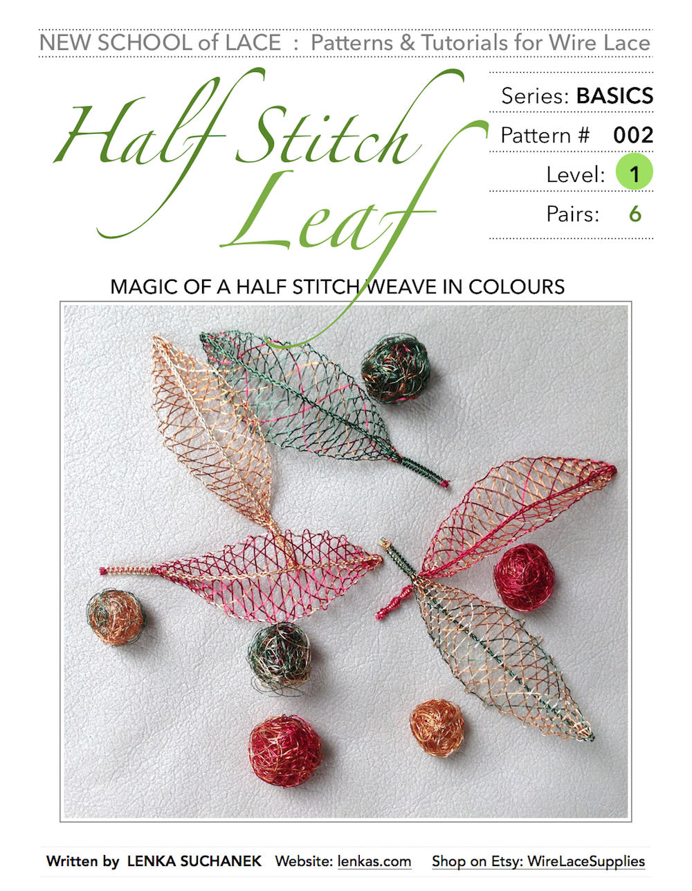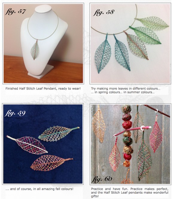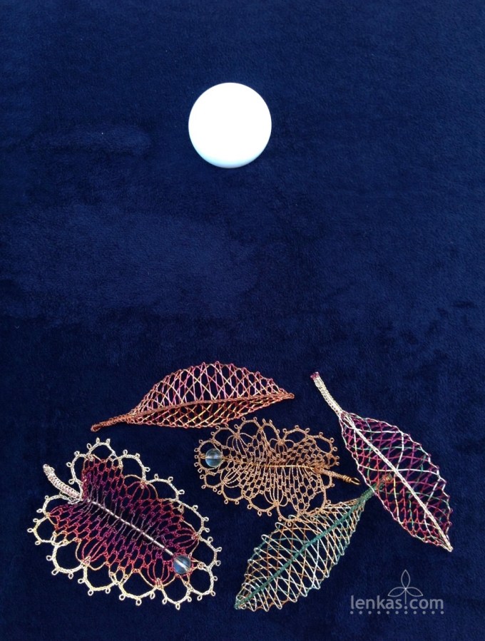 enamelled copper wires in autumn coloursOne of the designs, prepared for beginners, was chosen to be published in the New School of Lace Pattern & Tutorial Series. Complete instruction with pricking, working diagrams and detailed step-by-step photos is available for download in my online shop. The Half stitch Leaf is a simple pattern, which is easy to learn, yet looks quite complex when made in multiple colours. With imagination and practice, the new lacemakers can create their first lace pendants right away.