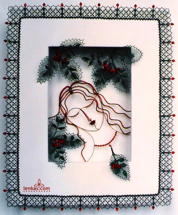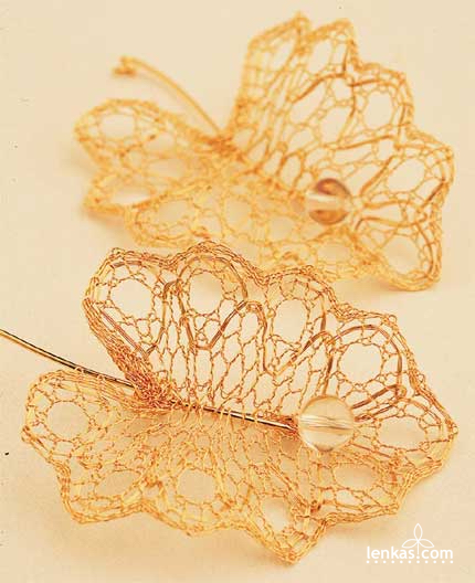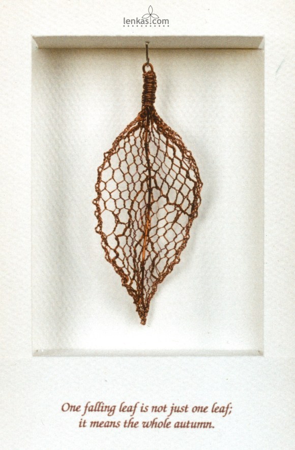 Falling LeafFine craft of lace was not much known in Western Canada when I arrived. I tried to present lace as an art form, so I conceived the Falling Leaf as a picture in handmade frame, from which the leaf could be removed and worn as pendant. My skills in wire lace were quite basic at that time. I worked with tools that were far from ideal, and the only copper wires I could find were recycled, often from old magnet coils. But it was exciting time of exploration and new ideas.