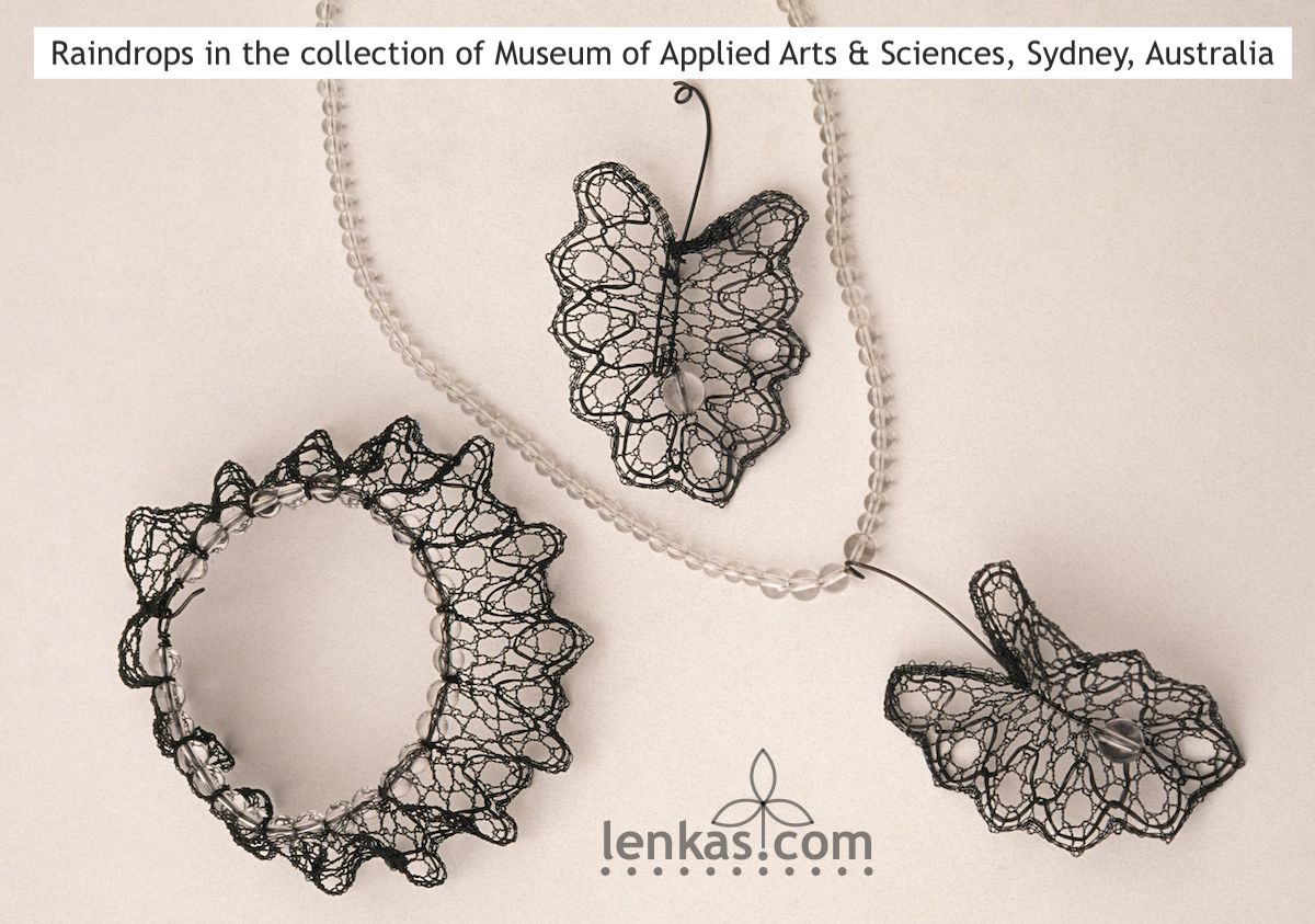 Raindrops in fine silver with clear quartz crystals. Photo: Kenji NagaiRaindrops Collection in oxidized silver with clear quartz beads was selected for the exhibition of finalists in the Powerhouse Museum’s second International Lace for Fashion Award in 2001.
