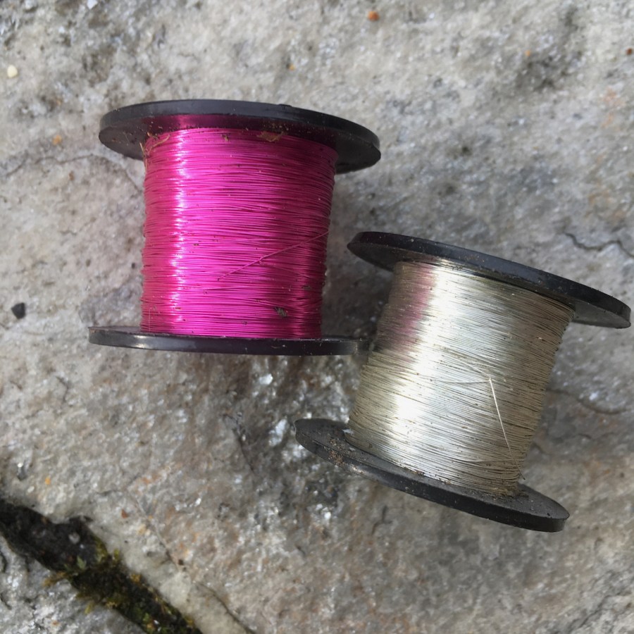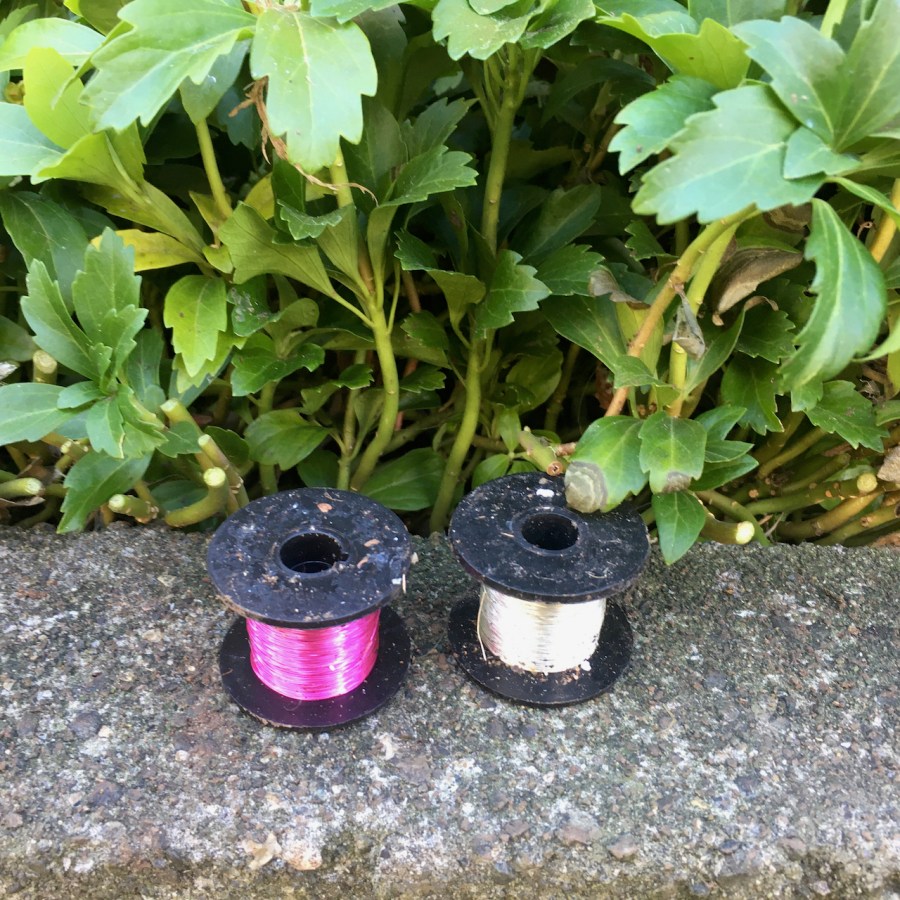 And soon enough, it did. This year, when I was working in my front yard, trimming back a pachysandra border, I noticed bright sparkle in the depth of the bundled stems. I reached in and pulled out two spools of wire, silver plated and bright pink colour. They looked like they have been there for a while, because the spools were all dirty. and wet. But the colours were still brilliant!