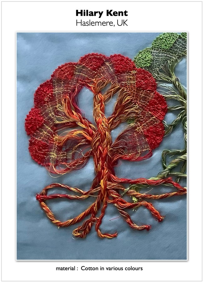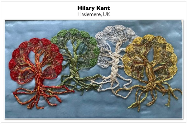 Hilary Kent from Haslemere in the UK shared a photograph of her Old Wise Tree creation: Four trees framed together in one picture as a beautiful illustration of the passage of time. Each tree, woven in multicoloured threads to a visually dramatic effect, is a unique artwork – original, bold and expressive. Daring choice of colours lends a distinctive character to individual trees. From subtle white and ecru threads, through soft greens, earthy yellows and browns, to flaming reds, the gradation of colours achieves a striking effect. All together, the trees create a harmonious whole. With their crowns overlapping and roots connecting, they seem to be morphing one to another in a natural progression of time.