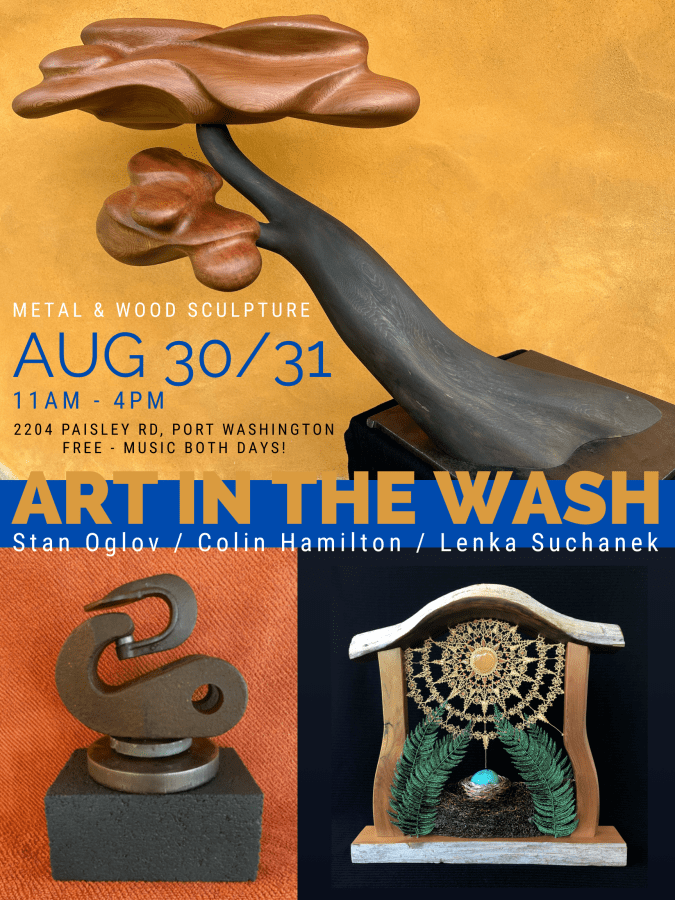 Our works are so different – Stan’s bold, strong and perfectly balanced metal sculptures, Colin’s organic, flowing wood carvings and my delicate and intricate lace – yet they merge, in a natural setting of a beautiful orchard garden, into one. I think what holds them together is the same force that inspires each of us to create, explore the craft and expand what’s possible. We have so much to talk about and when visitors engage in the lively conversation about art, love and life, the positive energy just grows and flows like waves of the surrounding ocean.