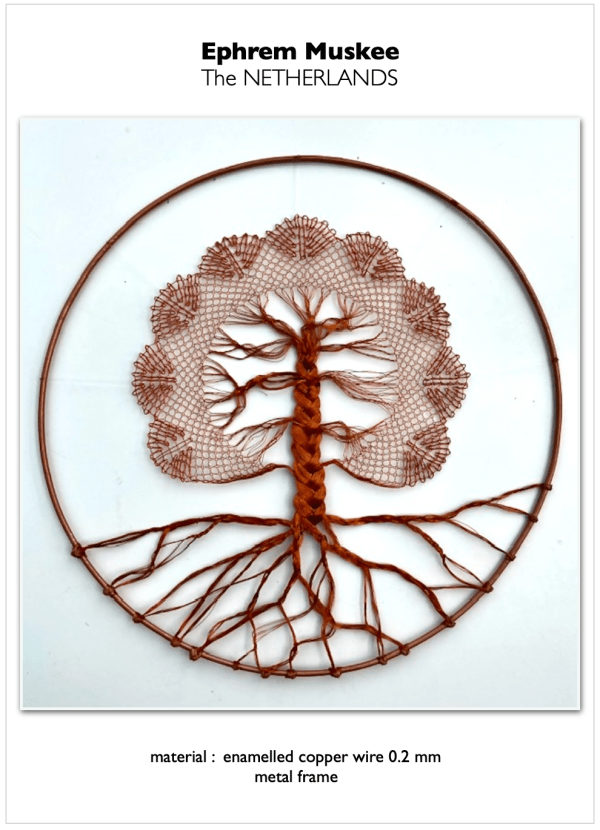 Wire is my favourite material for lacemaking, and I love to see its potential emerge and expand in hands of other lacemakers. Ephrem’s Old Wise Tree does just that and presents wire lace art at its best. The work shows a sound technique of an experienced lacemaker. Precise tensioning of the ground and the fan worker reveals that Ephrem mastered the wire medium, which is not an easy task, especially for a lacemaker used to work with fine threads. The tree’s branches, trunk and roots, too, are perfectly formed. Braiding and twisting 300+ strands of lively wires is a challenge, and it requires a lot of patience and practice to succeed.