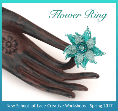 Requirements for Flower Ring: basic experience with wire lace (any previous New School of Lace workshops or courses) or previous lacemaking experience in fibre (familiarity with plaits and leaf tallies) is required.