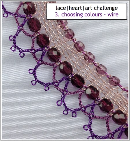 Sample made in wire has been made with enamelled copper wire size 0.2 mm (approx. 32 AWG): Single wire was used for plaits and a tape’s pairs (in combination of purple, violet and pink gold colours) and 4 wires of the same size were used together for the gimp. Preciosa Czech glass beads in 3mm and 4mm size were threaded on the gimp wires. If you want to work with the same wire size, you can use the original pricking (100%), which should also work for wire .22mm (approx. 31AWG). For wire 0.25mm (approx. 30 AWG), the pricking should be enlarger accordingly.
