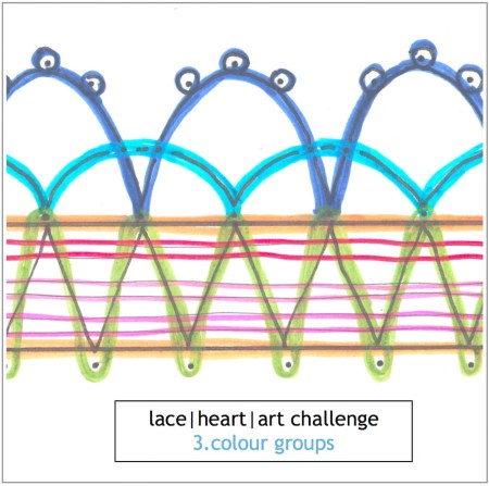 This diagram is showing groups of pairs in fibre design. Each group is marked with different colour, to explain the distribution of colours in the pattern: dark blue – 2 pairs, light blue – 2 pairs, yellow – 1 gimp pair, green – 1 pair worker in the tape, red/pink – 6 passive pairs in the tape. This should give you an idea how the colours weave through the pattern and help you with planning your heart’s colour arrangement.