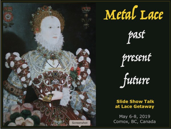 Metal Lace: Past, Present and Future – Slide show and talk for Peace Arch Weavers and Spinners Guild and guests, in the Honey Hooser Memorial Lecture