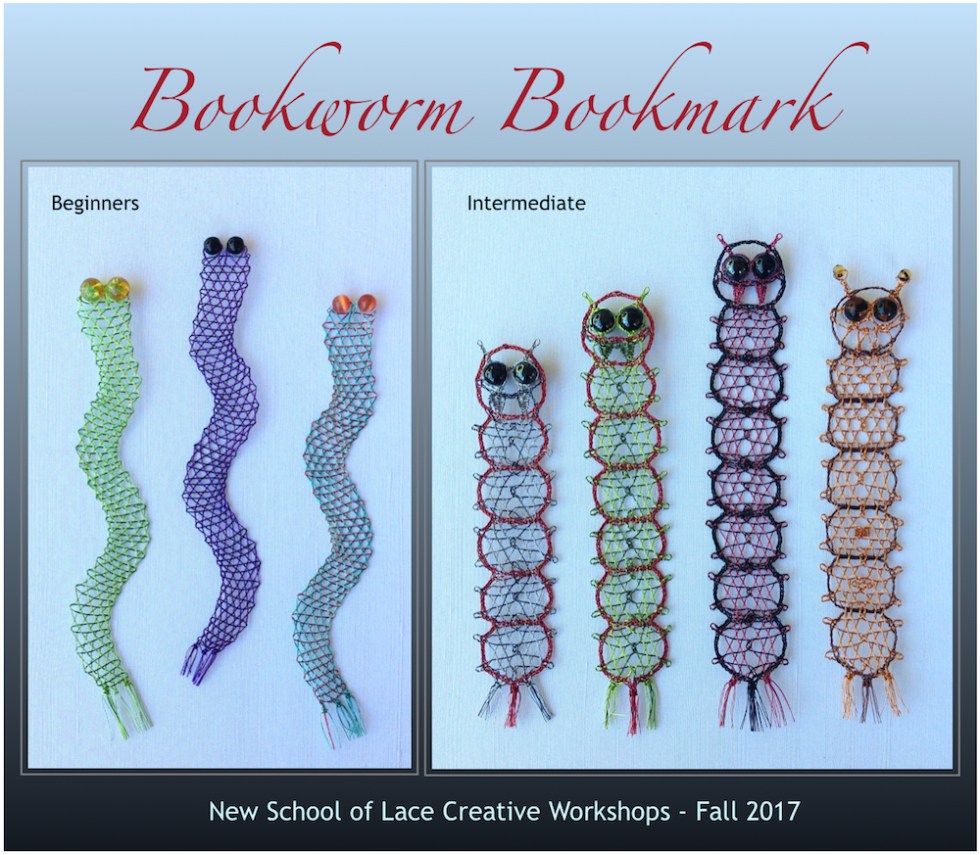 This back to school workshop is suitable for complete beginners as well as lacemakers with previous wire lace or fibre lace experience. Lace does not have to be just beautiful. It can be functional and practical as well. In this intensive one day workshop we will venture out in the world of books and learning, and will pursue those elusive, shy creatures who love books, and devour them with voracious appetite. We will observe their main features, and capture them in lace in a design full of shapes and colours. And then we will send the Bookworms out to their domain, a wonderful world of books and knowledge. Do you know any readers, young or old, who could use an original Bookworm Bookmark?