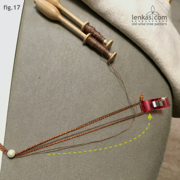 Before the second row starts, it is necessary to release threads form the footside pair. Place a support pin (pink) in the pinhole and lead the ground pair on the left side of the pin. This pair, instead of working a normal footside, is going to be unwound and anchored at the distance of approximately 40cm (16″) before it returns to the lace. Previously prepared support loop helps to measure this distance, and the attached wonder clip assist with holding the threads. Place a divider pin in top centre pinhole. Hang one support loop on this pin.