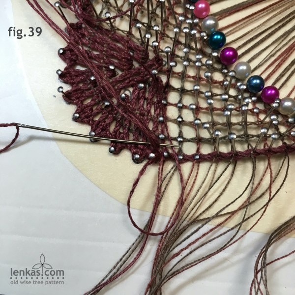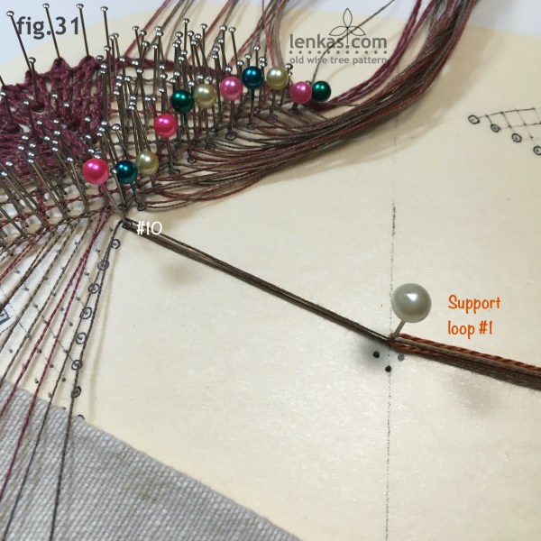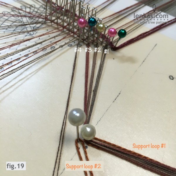 The footside support pin #4 (pink) starts the next group of three footside pairs whose threads will be gathered in the centre using the second support loop.