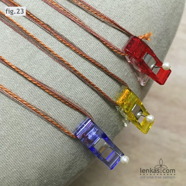 When working on a smaller pillow, where the support loop extends beyond the pillow’s edge, use one more divider pin as an anchor, bend the threads around it and then pin the clip close to the edge of the pillow.