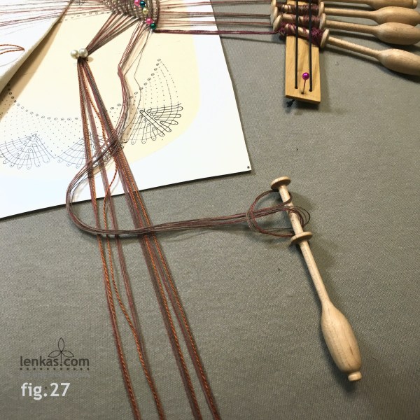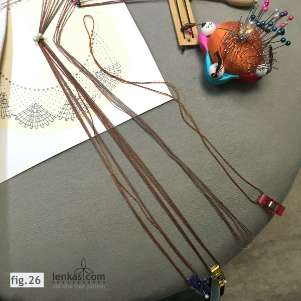 After the last row, divide the ground pairs in four groups (2-3-3-3 pairs) and wind the threads on support bobbins.
