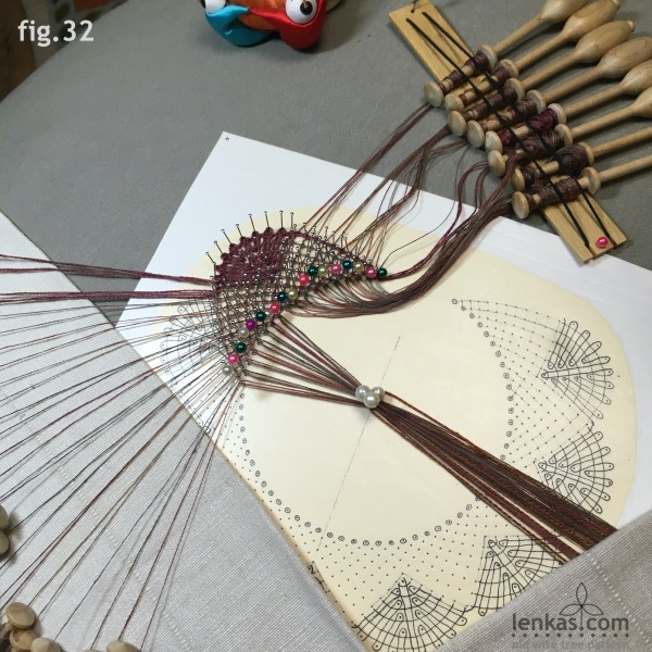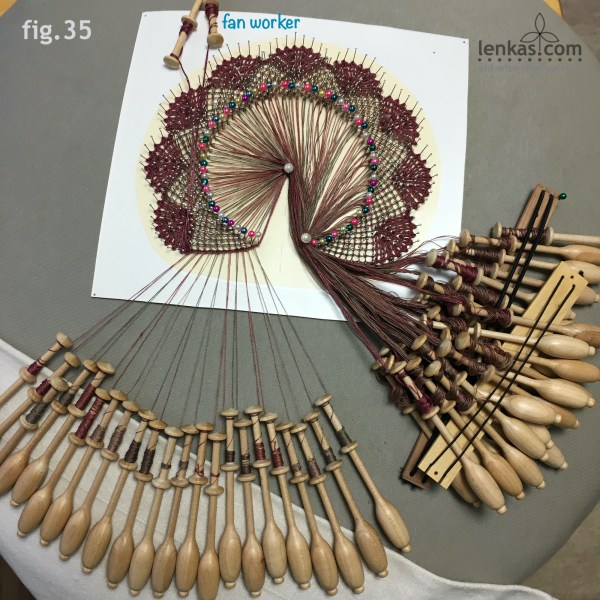 The first torchon ground segment is completed and all pairs are ready for the headside fan. Add the worker pair and make the fan. In the sample, a rather thick worker was used (2ply Barkonie linen 50/4) and that determined the stitches – see the Working Diagram. Other combinations of the fan stitches are possible, depending on the material.