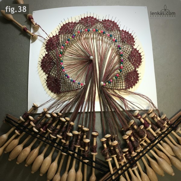 When the fan is finished, make sure that the following row of torchon ground ends with Brussels ground stitch (CTCT-pin-CTCT). This will keep the thick outline pair on the headside, ready to outline the next fan.
