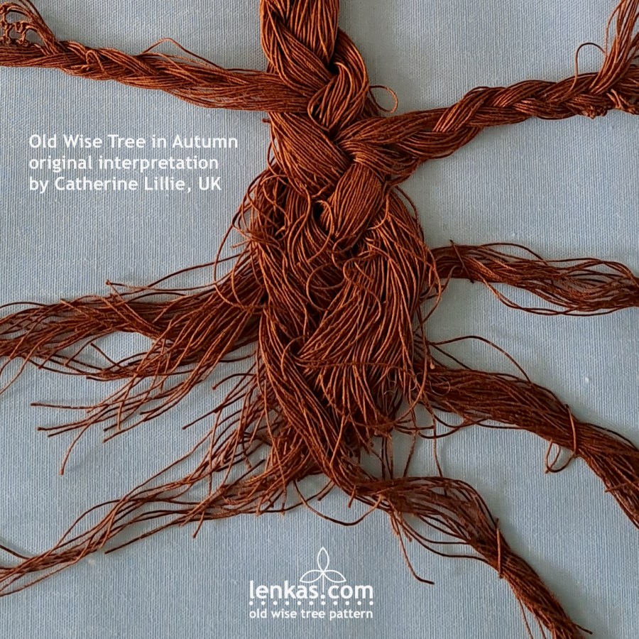 Lacemakers love patterns. We are all attracted to geometrical grids of dots and complex system of twists and crosses. We love our very orderly bobbins which keep our threads tidy. Within the structure, no matter how complicated, we can lead multitude of threads to successful completion of an intricate pattern. But when it comes to loose threads, we seem to get lost. That’s exactly where lies the test of the Old Wise Tree: the root work takes us to uncharted territory. We have to step out of the lacemaker’s mind, let go of an idea of a perfect order and work with unbound threads. At first, it is uncomfortable, confusing, even bewildering, but as soon as we give up control the roots start to flow and find their place. The finished tree brings a big relief and a sense of accomplishment, earned through the difficult underground journey.