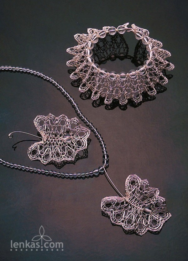 Handmade bobbin lace in fine silver wire, oxidized, with quartz crystals. Photo: Kenji Nagai