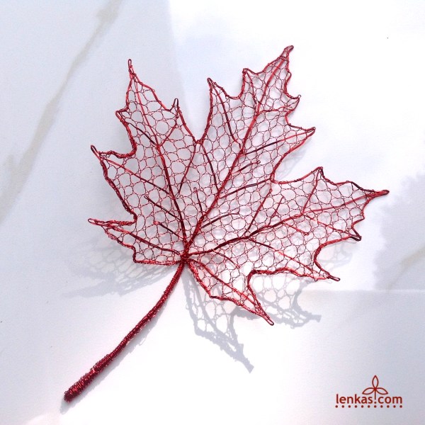 Sugar Maple leaf in enamelled copperAfter twenty years, I still find a lot of joy in making lace leaves. They are small and do not take too much time to finish. With use of rich palette of wire colours, each leaf is different, and truly original.