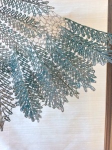 I was looking for frames for a new body of work, and I found Colin Hamilton, an artisan-woodworker, who works with cedar driftwood collected on the beaches of Gulf Islands. He hand splits the logs and builds gates, furniture and art, using traditional joinery techniques. Colin agreed to make some frames for me and I left it up to him to chose size and shape. The frames were beautiful when they arrived – very organic, and like no other frames I used before. They were already art pieces in their own right, and it was not difficult to see how they should be completed with lace. One small frame was asking for waves and I decided to use steel wire, because the Pacific Ocean on the Canadian West Coast often looks like it is made of steel. I couldn’t see though what pattern to use for lace, because all traditional lace designs lacked the fluidity I envisioned. I decided to create my own pattern, but since that takes long time, I put the piece on hold to let the design percolate. By chance, I was contacted by Veronika Irvine, a University of Victoria PhD candidate and a fibre artist, who developed a mathematical model to describe bobbin lace tessellations. From this model she generated thousands of original grid designs. Veronika was looking for lacemakers who would test the new patterns. I tried, and immediately realized that this was exactly what I wished for for my new piece – and much, much more…